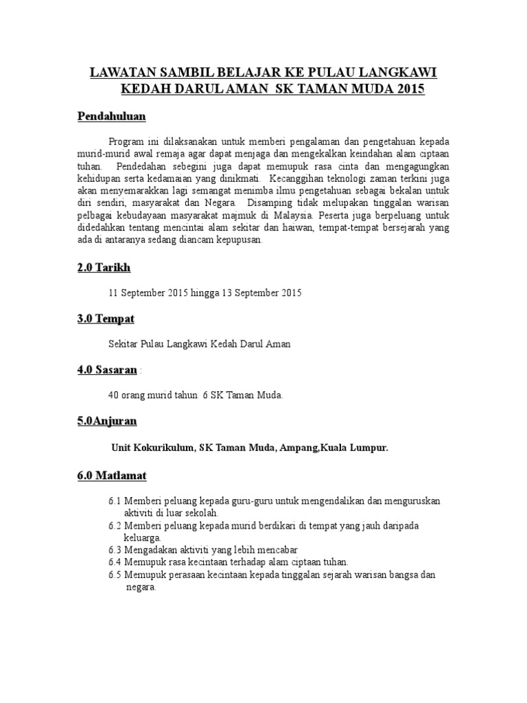 Kertas Kerja Lawatan Ke Langkawi from reader021.docslide.net Report kertas kerja lawatan ke legoland johor. Lawatan sambil belajar ke langkawi tajuk : Kertas cadangan lawatan profesional kelab staf langkawi. We are a sharing community. .kertas kerja program/aktiviti tajuk : Kementerian luar turki membuat kenyataan bahawa perkembangan semasa dan antarabangsa akan dibincangkan dalam pertemuan yang akan diadakan semasa lawatan menteri mevlüt çavuşoğlu. 27 februari 2016 tempat : Contoh kerts kerja pinjaman tekun.