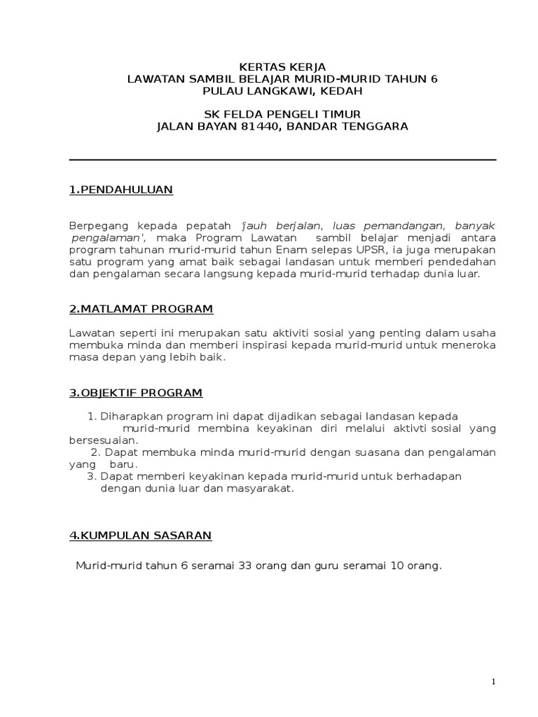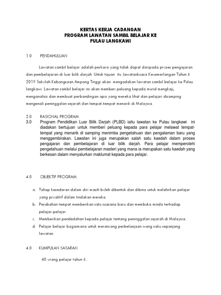 2.1 surat kelulusan mengadakan lawatan daripada pengetua sekolah 2.2 kertas kerja lawatan sambil belajar ke tempat bersejarah dan tempat menarik di pulau langkawi. Diploma akauntansi (dat 5a) politeknik seberang perai kementerian pendidikan malaysia jalan permatang pauh 13500 permatang pauh. Puan norita binti harijaman disediakan oleh: Contoh kerts kerja pinjaman tekun. Download kertas kerja lawatan ke legoland johor.